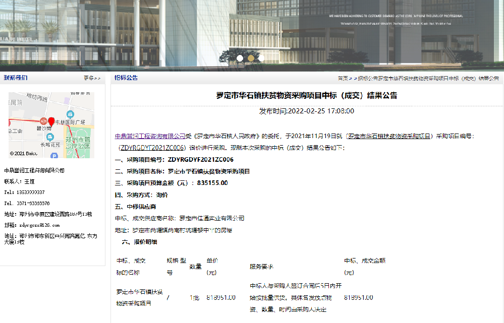 鼎點(diǎn)娛樂工程咨詢有限公司受《羅定市華石鎮(zhèn)人民政府》的委托,于2021年11月19日就(羅定市華石鎮(zhèn)扶貧物資采購項(xiàng)目)采購項(xiàng)目編號(hào):(ZDYRGDYF2021ZC006)詢價(jià)進(jìn)行采購。現(xiàn)就本次采購的中標(biāo)(成交)結(jié)果公告如下:一、采購項(xiàng)目編號(hào):ZDYRGDYF2021ZC006二、采購項(xiàng)目名稱:羅定市華石鎮(zhèn)扶貧物資采購項(xiàng)目三、采購項(xiàng)目預(yù)算金額([詳細(xì)]